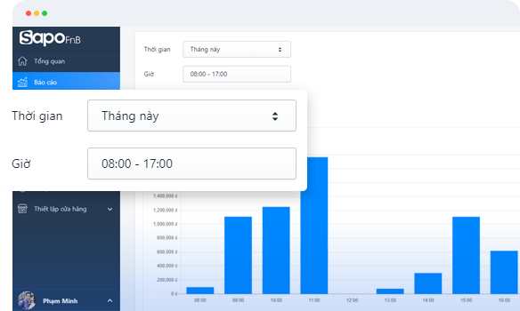 Sapo FnB còn mang đến hệ thống biểu đồ khoa học giúp chủ quán có cái nhìn tổng quan về tính hình kinh doanh trong quán và từ đây bạn có thể đưa ra các chiến lược kinh doanh cũng như các chiến dịch marketing,chăm sóc khách hàng một cách tốt nhất
