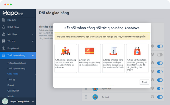 Không chỉ hỗ trợ nhân viên order ngay tại bàn, Sapo FnB còn kết nối với đối tác giao hàng AhaMove. Đơn hàng tự động chuyển cùng lúc tới khu vực chế biến và đối tác giao hàng. Trong lúc chờ đợi nhân viên vận chuyển tới lấy, cửa hàng nhanh chóng hoàn thiện món ăn, đồ uống để trao tận tay khách hàng với chi phí hợp lý, thời gian ngắn nhất.